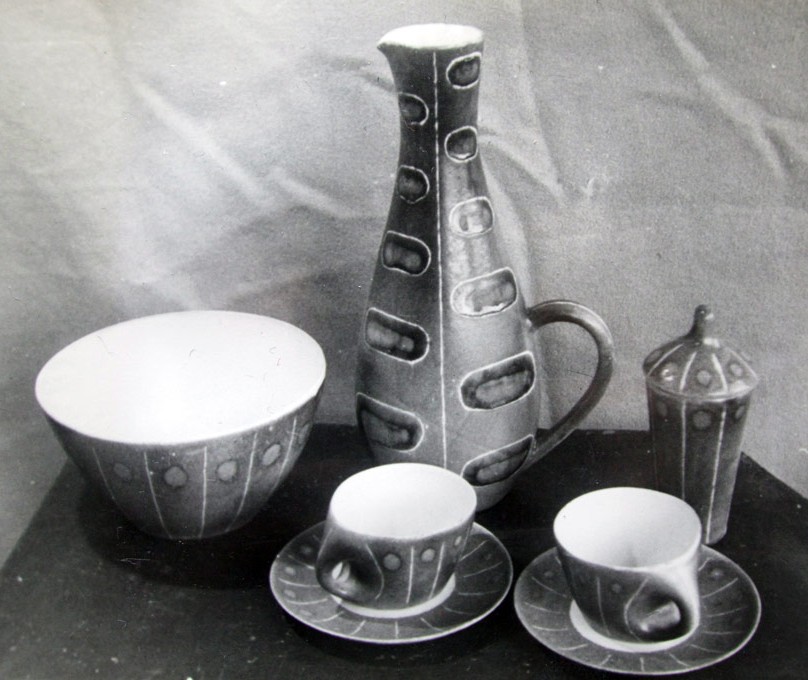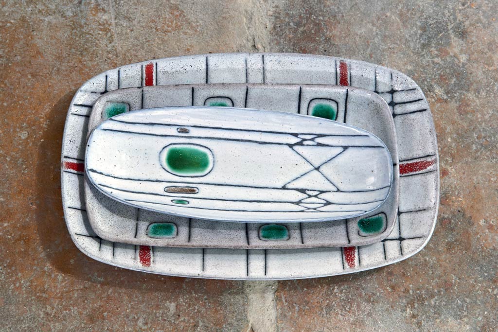 Sur quelques petits modèles, cendriers, coupelles ou raviers, il réalise même des séries à l’aide de techniques mixtes et à partir de motifs toujours abstraits à dominante géométrique. Ces décors des années 50 tiennent moins compte que ceux des années 60 et 70 des volumes des pièces sur lesquels ils sont appliqués. Cependant, surtout utilisées seules et de façon rectiligne, les incisions constituent une forme élémentaire d’ornement qui joue déjà un peu avec les volumes comme il le développera ultérieurement avec plus d’ambition.